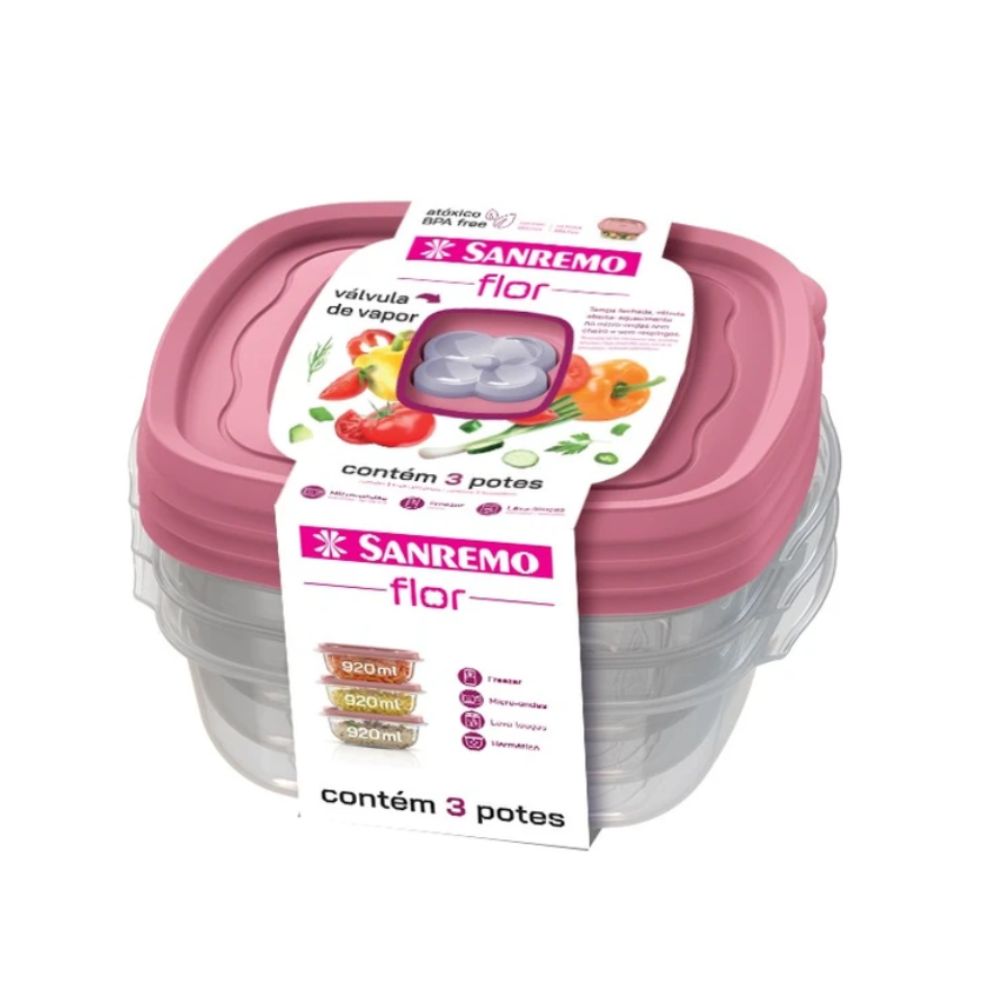 Conjunto 3 Potes Plásticos Quadrados Hermético Rosa 920ML Flor Sanremo