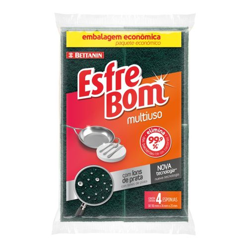 A Esponja Multiuso EsfreBom Bettanin Leve 4 Pague 3 compõe a única linha no mercado brasileiro com íons de prata que eliminam até 99,9% das bactérias. Além de manter a cozinha mais segura, a nova fórmula garante ainda mais resistência: a esponja fica nova por mais tempo! Esse item possui embalagem econômica: você paga 3 e leva 4 unidades.
