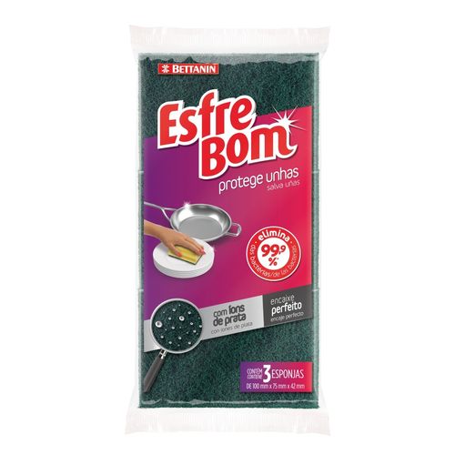 A Esponja Multiuso Protege Unhas EsfreBom Bettanin 3 Unidades faz parte da única linha do mercado do Brasil com íons de prata que eliminam até 99,9% das bactérias. Além de manter a cozinha segura, a nova fórmula garante ainda mais resistência: a esponja fica nova por mais tempo! A versão Protege Unhas possui formato especialmente desenvolvido para evitar o contato das unhas com os utensílios por meio de um encaixe perfeito para as mãos na lateral da esponja.