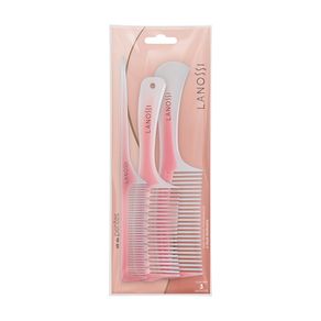 O Kit de Pentes Trançado, com Cabo Fino e Longo Rosé Lanossi 3 Unidades possui 3 modelos de pentes ideais para o seu dia a dia. O Pente com Cabo Longo e o Pente Trançado podem ser utilizados para pentear e desembaraçar todos os tipos de cabelo e o Pente de Cabo Fino é ideal para pentear os fios finos, separar mechas e criar penteados incríveis! São produzido em material resistente e cerdas com pontas arredondadas que permitem um pentear suave e confortável, sem danificar os fios úmidos ou secos. Esse produto deve ser sempre armazenado em locais limpos e secos, ao abrigo do sol e do calor. A linha Rosé da Lanossi possui acabamento na cor Rosé com um incrível e moderno efeito degradê para mais estilo ao pentear os fios!