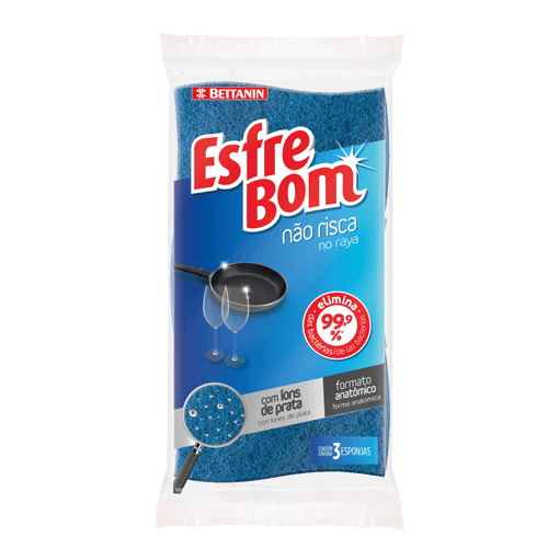 As tradicionais esponjas azuis estão ainda mais resistentes com o formato anatômico para melhor precisão durante a limpeza. Chegou a nova fórmula da Esponja Multiuso Não Risca EsfreBom Bettanin! Ela limpa e cuida de superfícies antiaderentes, cerâmicas e vidros sem riscar.