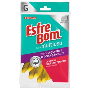 A Luva Látex Multiuso Grande Amarela EsfreBom Bettanin, como o nome já diz, é versátil e pode ser usada em qualquer atividade. Graças a sua textura antiderrapante, ela facilita o tato e garante segurança na manipulação dos objetos. Além disso, possui forro interno de algodão, conferindo maior conforto durante as tarefas diárias. Seu tamanho é grande.