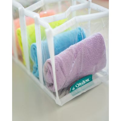 Organizador de Gavetas Flexível Colmeia Pequena 10 Divisórias Transparente My Closet Ordene é ideal para manter suas roupas e acessórios sempre organizados em gavetas, armários e closets. As Colmeias Organizadoras My Closet estão disponíveis em três tamanhos: Pequena, Média e Grande. A versão pequena é perfeita para roupas íntimas, de banho, de bebê ou acessórios e comporta até 10 peças.