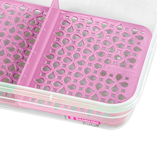 O Pote Plástico com Travas Hermético com Grade Açaí 1,6L Freshy Sanremo conta com divisória e grade interna, além de um design moderno, inteligente e funcional: possui borracha integrada na tampa, quatro travas com aquele “click” - que garantem o fechamento hermético - e o melhor: os potes da Linha Freshy são modulares, o que permite um empilhamento perfeito e maior otimização do espaço na geladeira, no freezer e nos armários. Com a linha Freshy da Sanremo, o colorido e o frescor dos alimentos vão dar mais vida e beleza na sua cozinha.