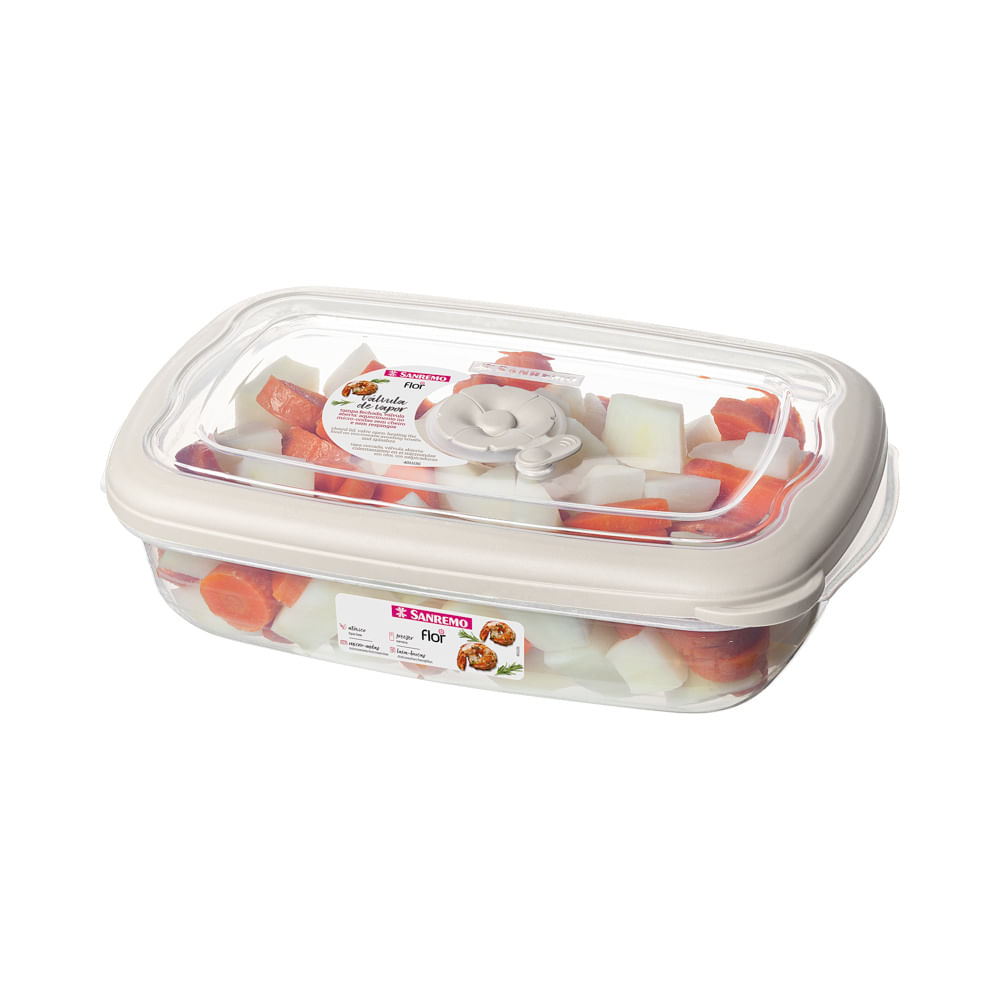 O Pote Plástico Retangular Hermético Cappucinno 1,26L Flor Sanremo conta com design moderno, borracha de vedação integrada na tampa e válvula em forma de flor que libera a saída do vapor: quando aberta, permite que o pote vá tampado ao micro-ondas.