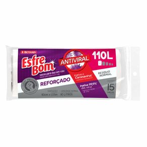 O Saco de Lixo Antiviral em Rolo com Fundo Reforçado Branco 110L EsfreBom Bettanin 15 Unidades possui tecnologia que inativa o grupo de vírus do Coronavírus*, oferece maior segurança e proteção a todos que tiverem contato direto com os resíduos descartados, evitando contaminação cruzada. O produto, que vem com 40 unidades de saco, é branco, além de ser muito resistente e reforçado. Sua eficácia é comprovada em laboratório. *Teste realizado em laboratório externo, na cepa Alfacoronavírus (CCov - VR - 809), mesmo gênero das espécies Sars-Cov-2, comprovando a inativação dos vírus em até 99,9% presentes nas esponjas, pano multiuso e sacos para lixo em tempo de contato mínimo de 15 minutos.